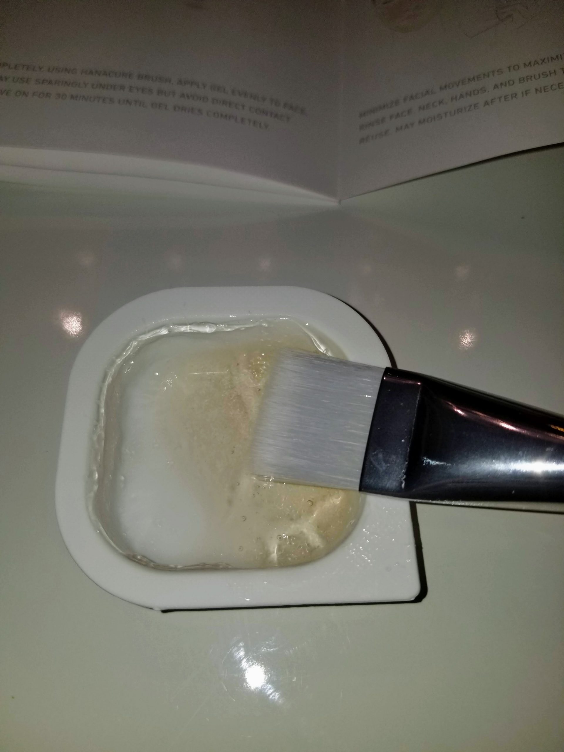 With your Hanacure applicator brush in one hand and your newfound confidence in the other, apply the gel like solution all over your face (avoid putting on your lips) & neck, & sparingly under the eyes (avoid direct contact with the eyes & using on the lids). After fully applying to those areas, if you have any extra gel solution, you can put it on the backs of your hands which will leave them feeling super soft. Leave the facial on (and product on hands) for 20+ minutes or wait until gel dries completely. Wash off with warm water. I will say that you would think it would be sticky or tacky to rinse off and you might have to scrub your face to release the substance, but it is not like that at all. Super easy rinse off.