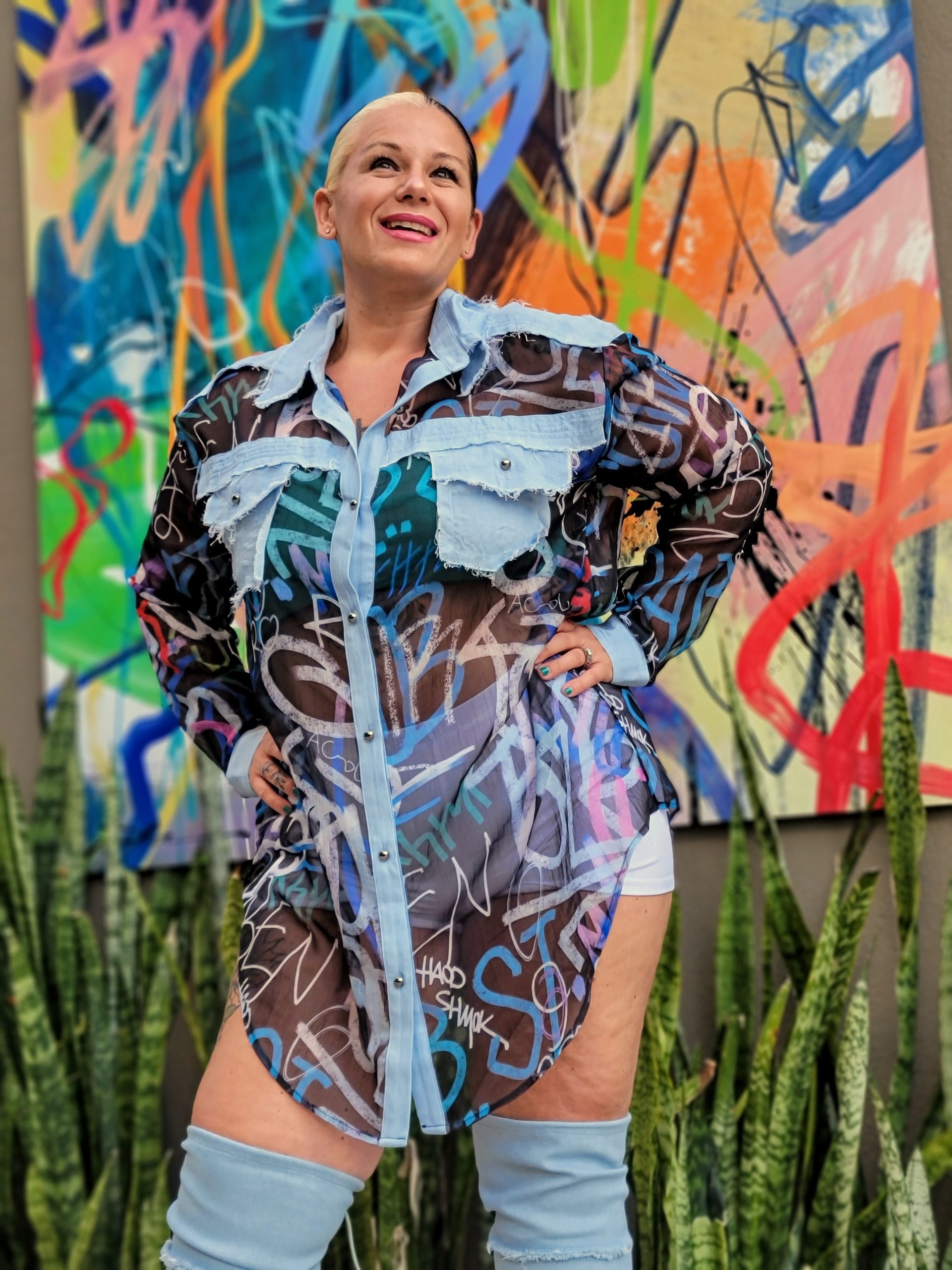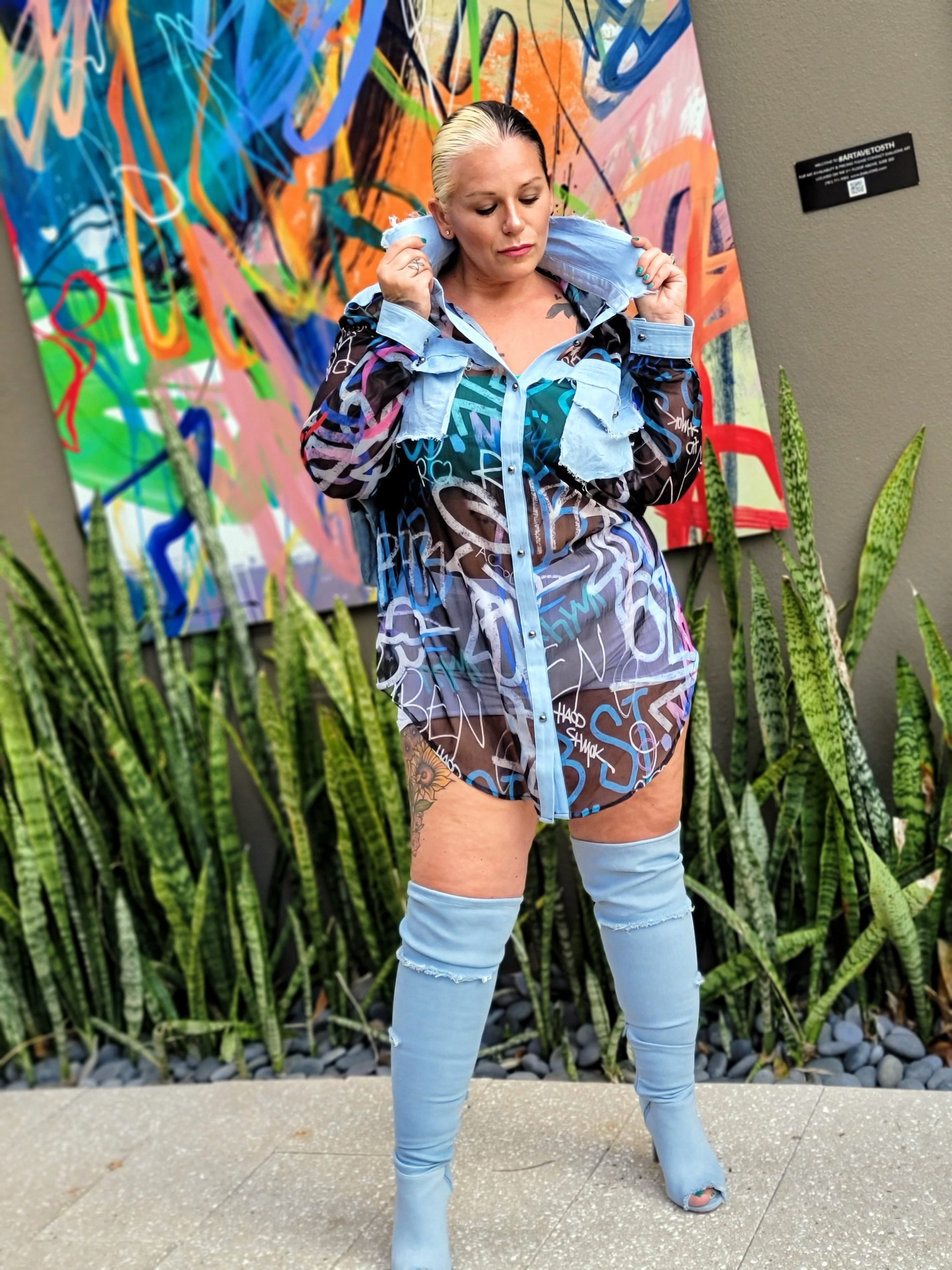 I’ve been on a hunt for art as backdrops for my pictures lately. I’m legit I-N-F-A-T-U-A-T-E-D with finding murals that blend perfectly with an outfit I put together. Something about finding amazing wall art to compliment any get up, plus I love supporting & showcasing talented artists’ work. So, when we were heading out to Naples for our end of the summer vacay, I knew I had to check out #ArtAveOn5th in downtown. About a 15 minute ride from where we were staying,we decided to head down there for dinner out first night in town. I just happened to bring an outfit with me that would look great with this backdrop (ok, maybe that was planned just a tiny itty bitty bit lol) but if I wore it there or not, we knew going to 5th Ave was in our agenda. My favorite season was coming to an end and I had to go out with a bang in a see thru graffiti & denim number with some FMP thigh high denim peep toe boots to match. Yup, you got that right. No shame in my game or my outfit. I have a niché for this kind of thing, I guess. The writings were on the wall…..and on me. The perfect pair to say goodbye to summer 🙌