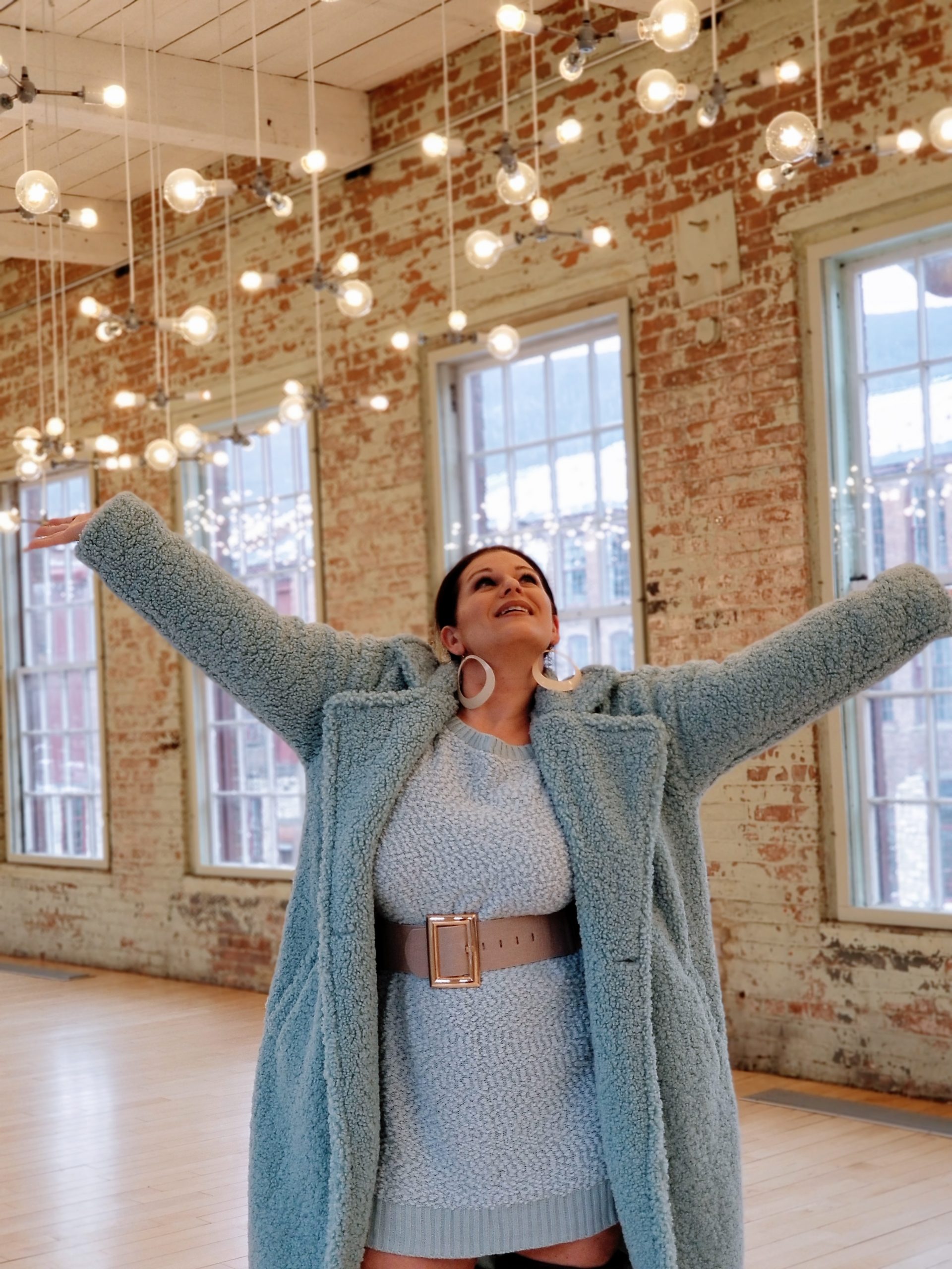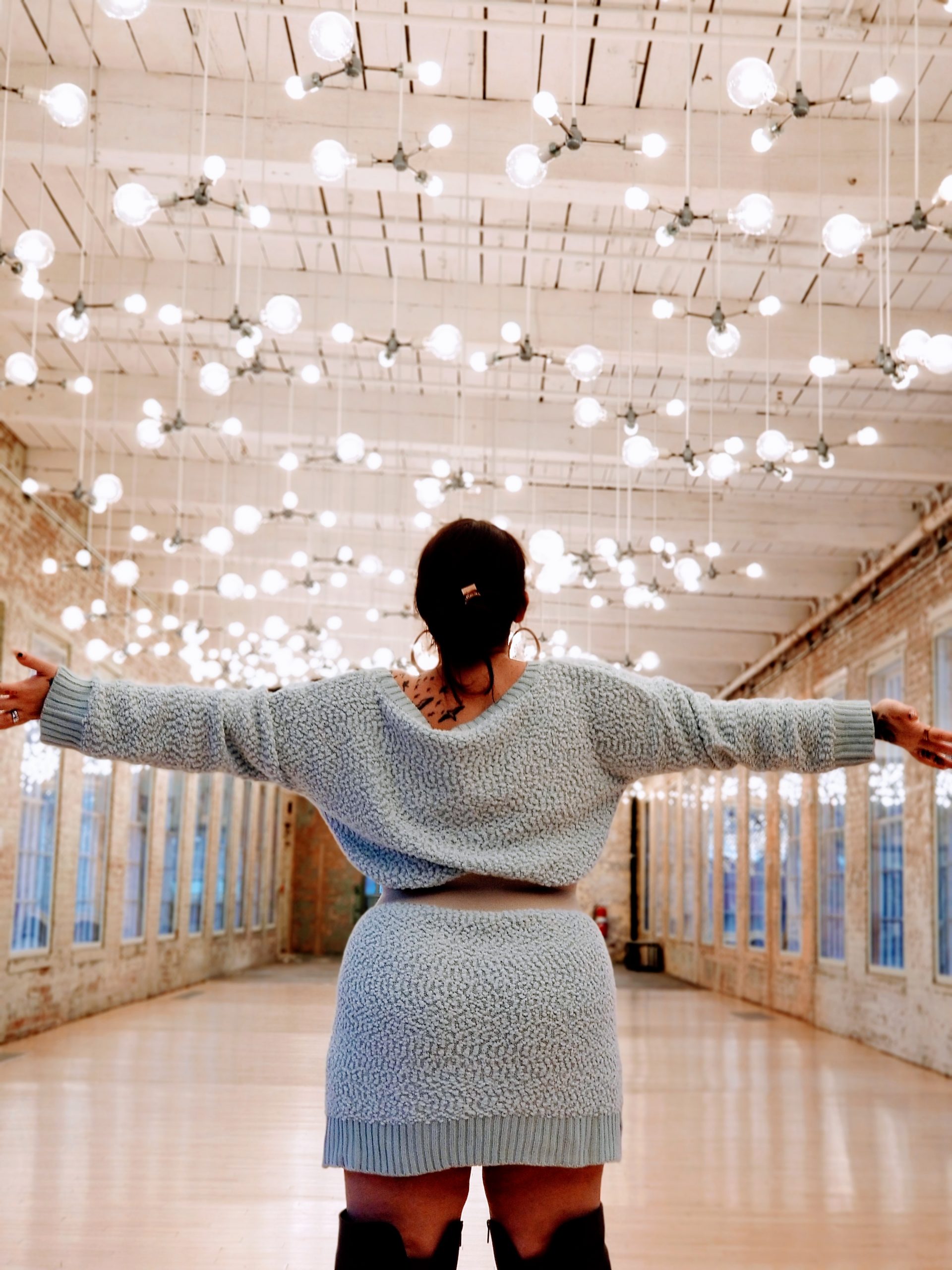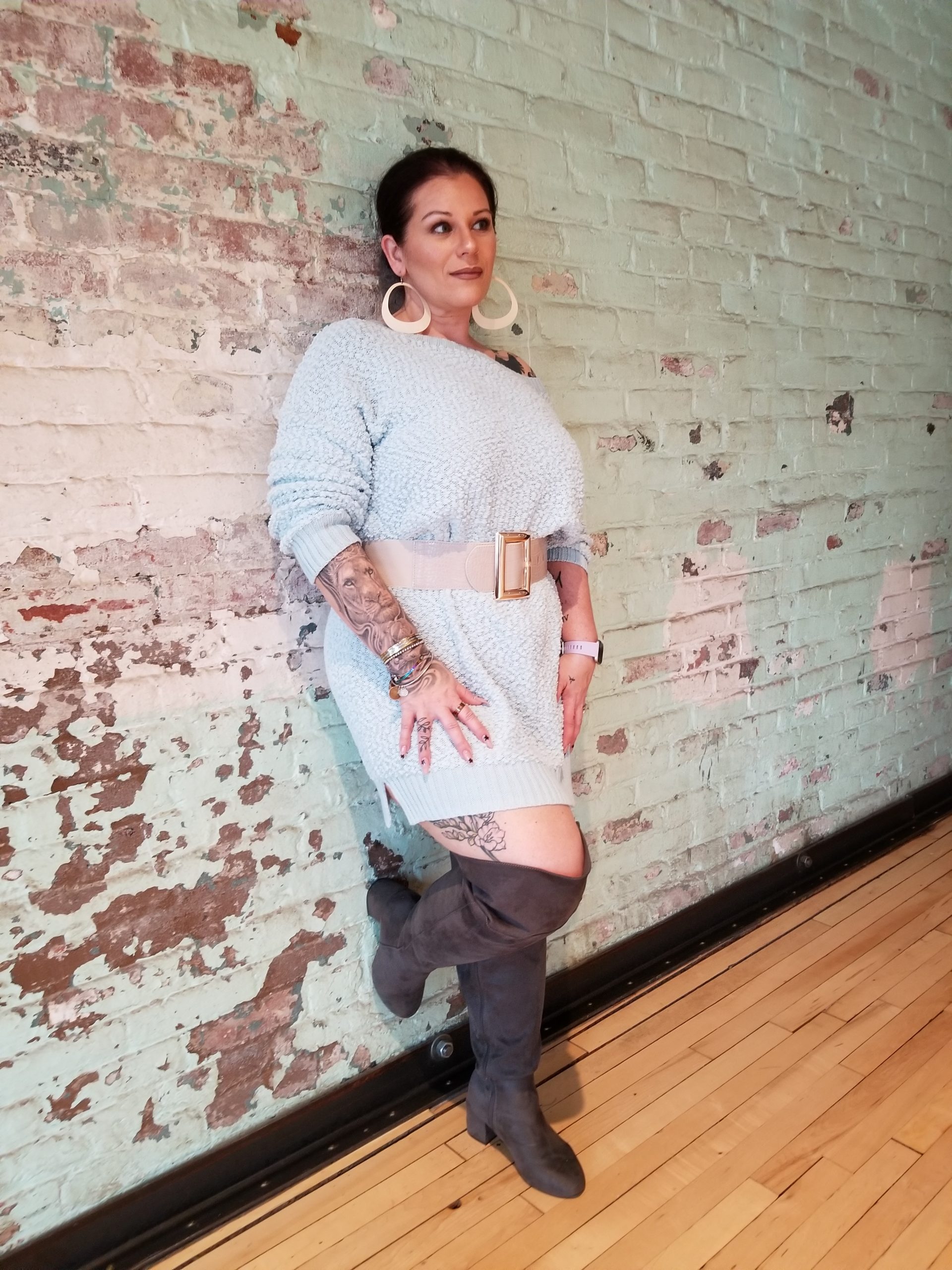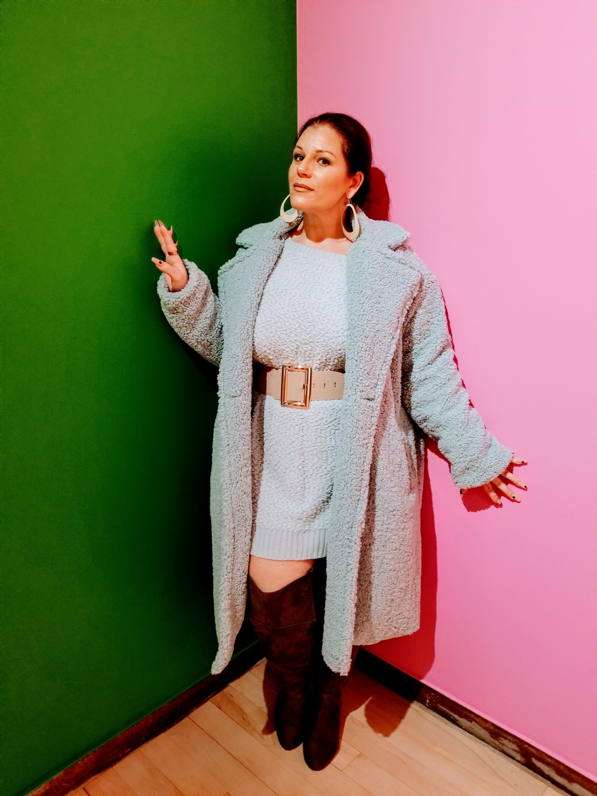 Even though it is February (and almost March), we are full blown into winter in New England, and that doesn’t mean we can’t wear light colors; especially when they blend oh so well with each other. President’s weekend in MA, it was around 40 degrees where if you are from this area, you know that this is like summah for us lol. The perfect days to enjoy a Sunday visit to a museum or two and walk the eclectic grounds all while soaking up that winter sun. This makes for, IMO, the perfect winter day. Chilly but not unbearable. Cold but sun shining. I decided to wear a thin, off the shoulder sweater dress, well because it was going to be nice out and I wouldn’t be freezing my behind off. The dress I picked was the ‘Cuddled Up Tunic Sweater’ dress in heather blue (a lighter shade of baby blue) from FN, paired it with my over the knee wide calf sized dark gray boots from Torrid, accessorized it with a cream elastic chunky belt from Akira and topped it off with a long furry, oversized, mint jacket from Forever21 Plus and voilà…..you get a comfy and caj dressup for a cool Sunday afternoon. Check out my post on Trippin’ It with the Vegas’ for an in depth look at our staycation getaway!