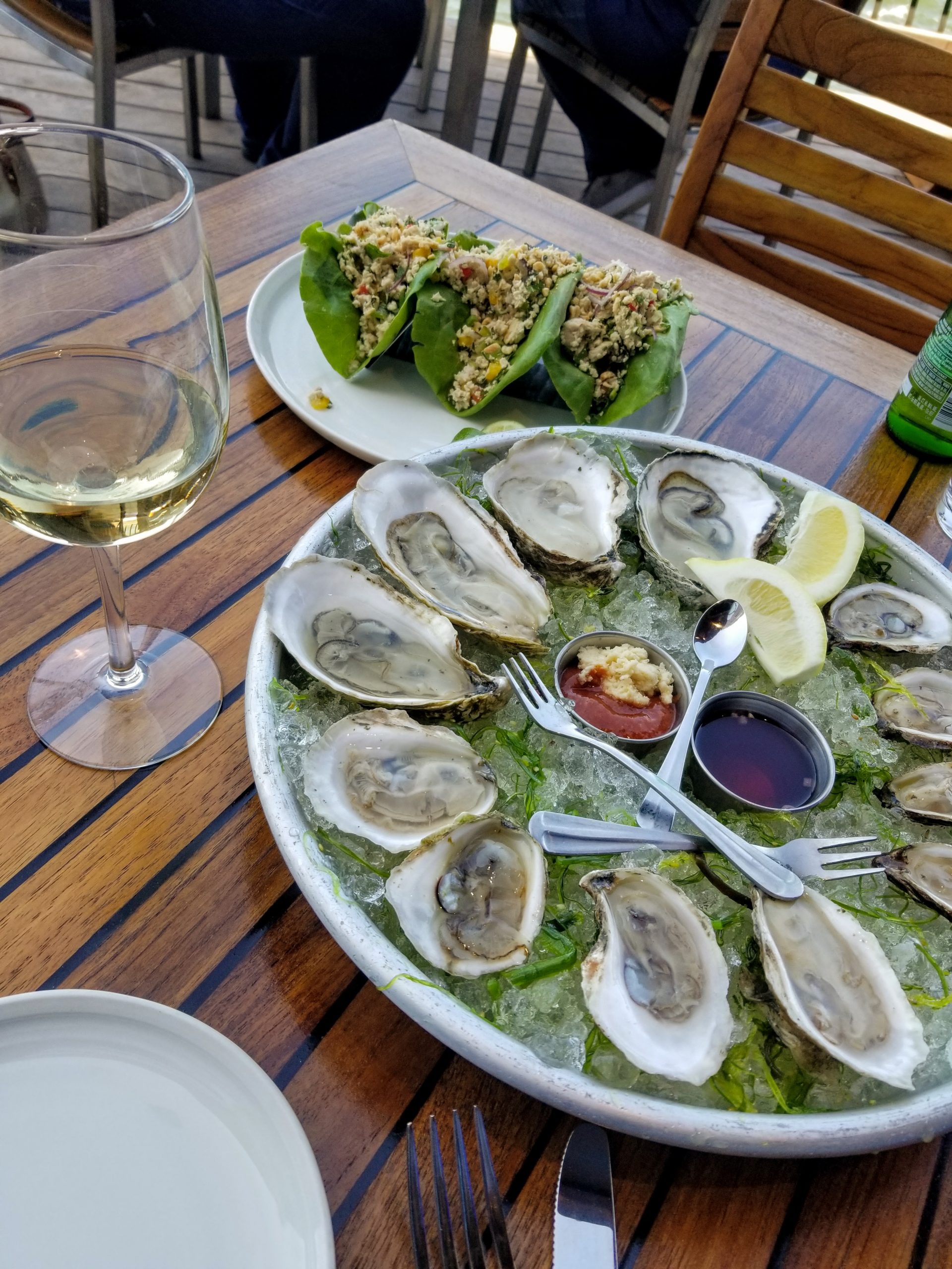 Earlier in the week, I made reservations at Martingale Wharf  https://www.martingalewharf.com/ for dinner on their spacious patio deck. Reservations are a requirement ATM due to limited seating, but the view and the ambience is so worth the experience. You literally are sitting on the water, so it does get a little chilly there especially in the shade, but they do offer tables with a fire pit so that’s a very cool feature.  The oysters and lobster salad are a MUST here. Reasonably priced, great atmosphere, romantic ambience and top notch hospitality. I give it five stars all around.